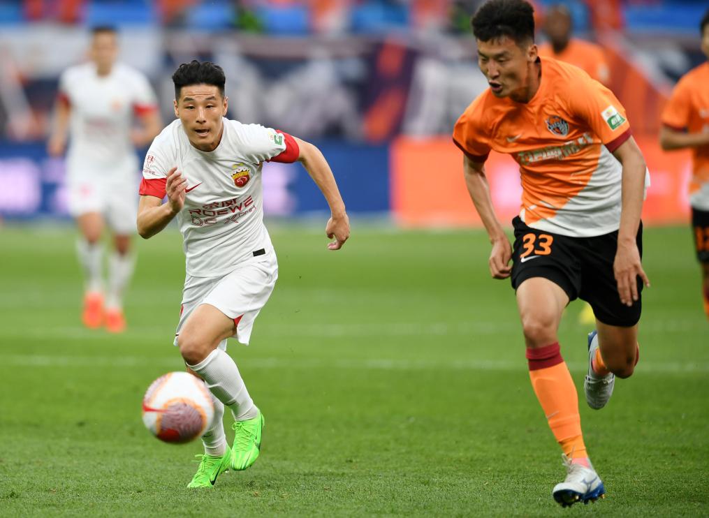 5月1日,上海海港隊球員武磊(左)在2024賽季中超第九輪比賽中帶球突破。新華社記者 李紫恒 攝