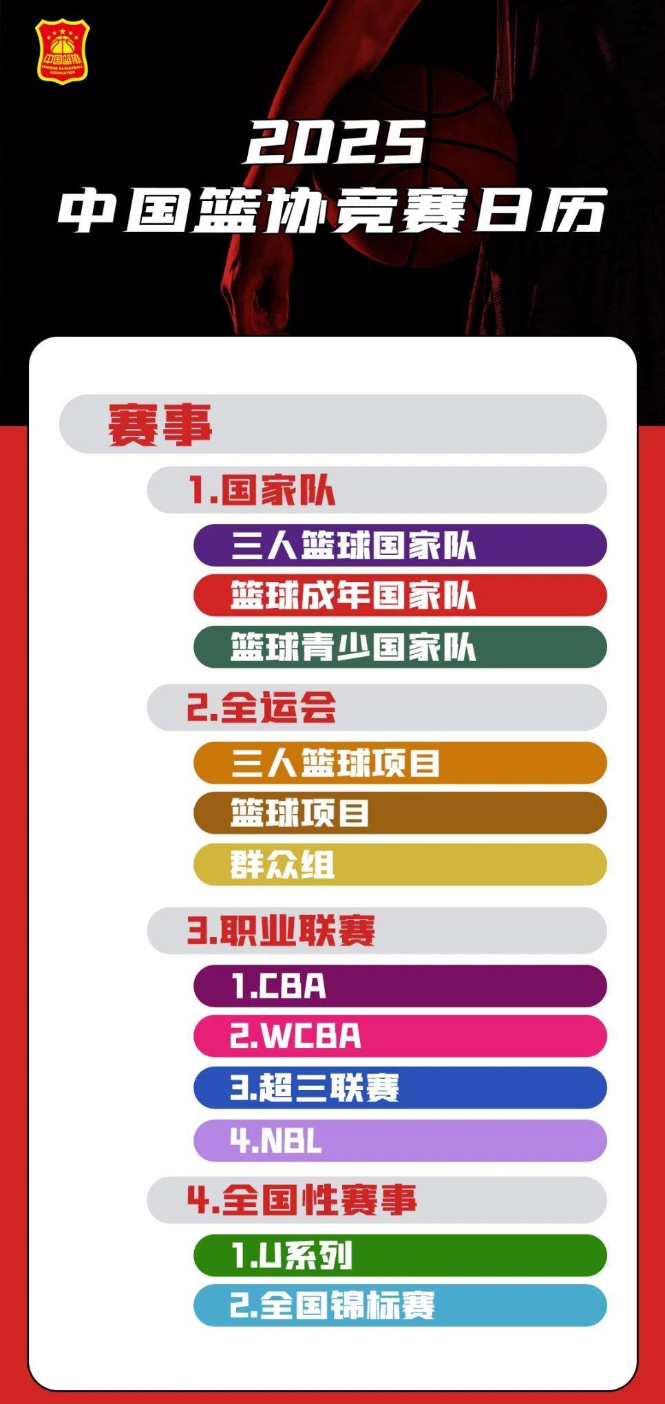 日前,中國(guó)籃球協(xié)會(huì)發(fā)布2025年的競(jìng)賽日歷,所有賽事按照編排賽歷時(shí)的優(yōu)先程度分為5個(gè)層級(jí),包括各級(jí)國(guó)際比賽、職業(yè)聯(lián)賽等。中國(guó)籃協(xié)相關(guān)人士表示,這次對(duì)外公布的只是前四個(gè)層級(jí)的已確定賽事。中國(guó)籃協(xié)和學(xué)體聯(lián)聯(lián)合主辦的一些教育系統(tǒng)的賽事屬于第五個(gè)層級(jí),待有關(guān)細(xì)節(jié)確定后也會(huì)公布。