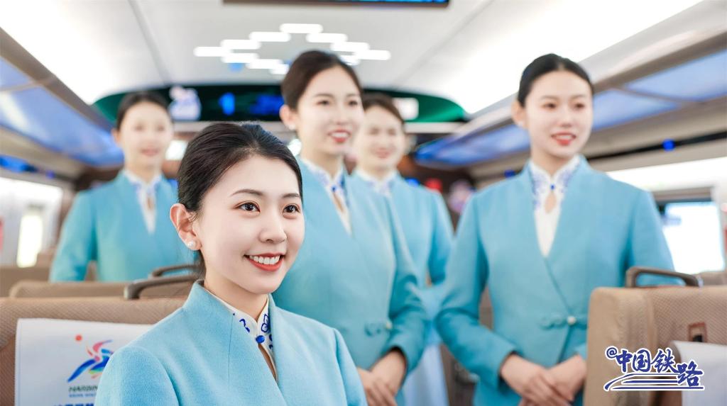 列車上,乘務員身著帶有雪花刺繡的藍白衣裙,熱情、得體地與乘客交流。車廂內(nèi)印有亞冬會元素的時刻表、貼紙隨處可見,營造出濃厚的冰雪體育盛會氛圍。