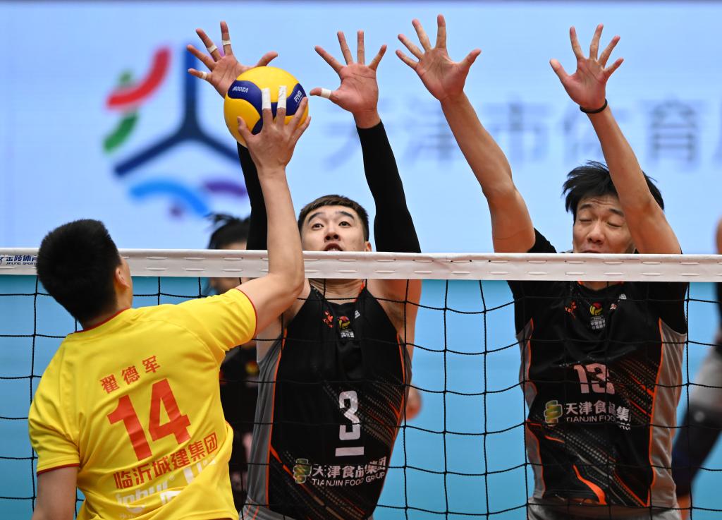 3月6日,天津男排球員毛天一(中)與隊(duì)友陳龍海(右)在比賽中攔防山東男排球員翟德軍的扣球。新華社記者 孫凡越 攝