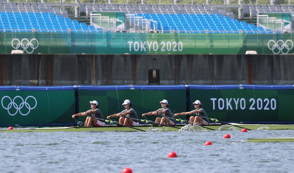 2021年7月20日,中國賽艇隊女子四人雙槳隊員在訓(xùn)練中。當日,中國賽艇隊在日本東京海之森水上競技場訓(xùn)練,備戰(zhàn)即將開幕的東京奧運會。新華社記者 杜瀟逸 攝