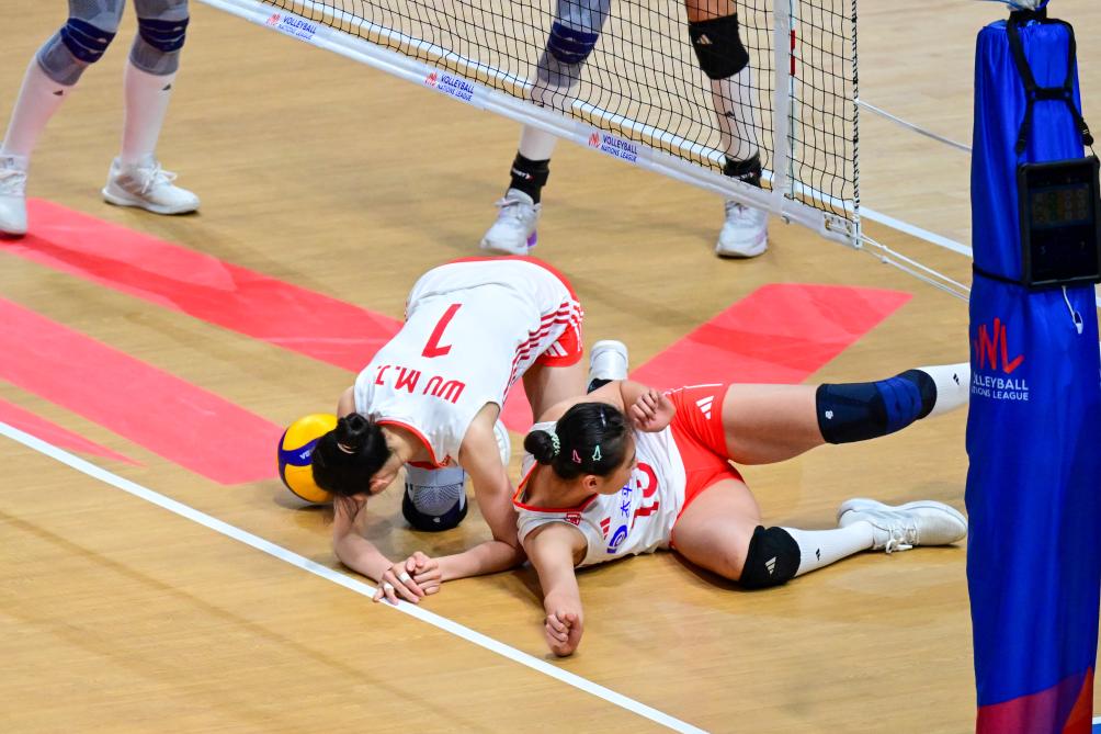 中國隊球員吳夢潔(下左)和王奧芊(下右)在比賽中救球。 新華社記者 朱煒 攝