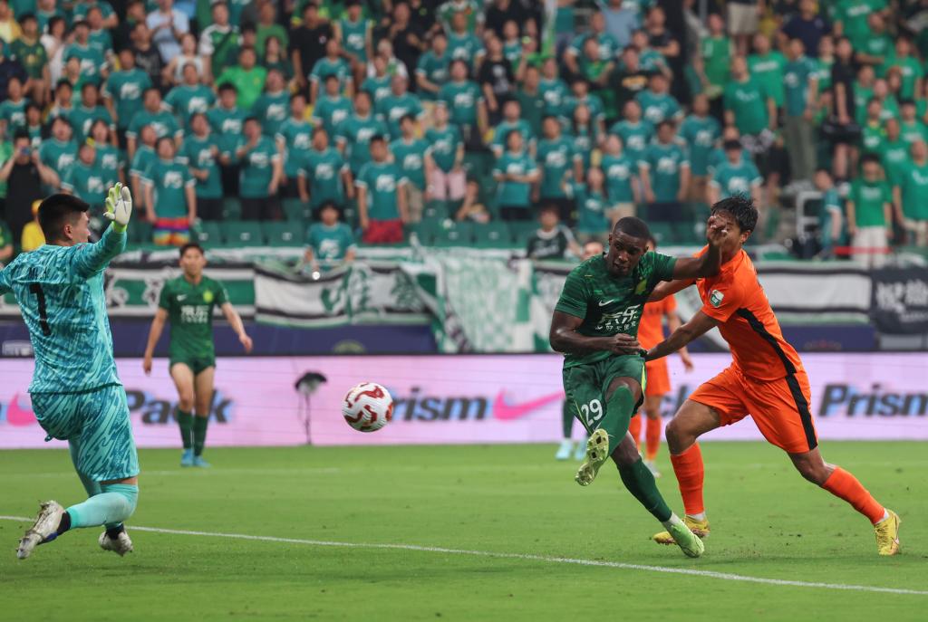 6月30日,北京國(guó)安隊(duì)球員法比奧(右二)在比賽中射門(mén)得分。新華社記者 胡星宇 攝