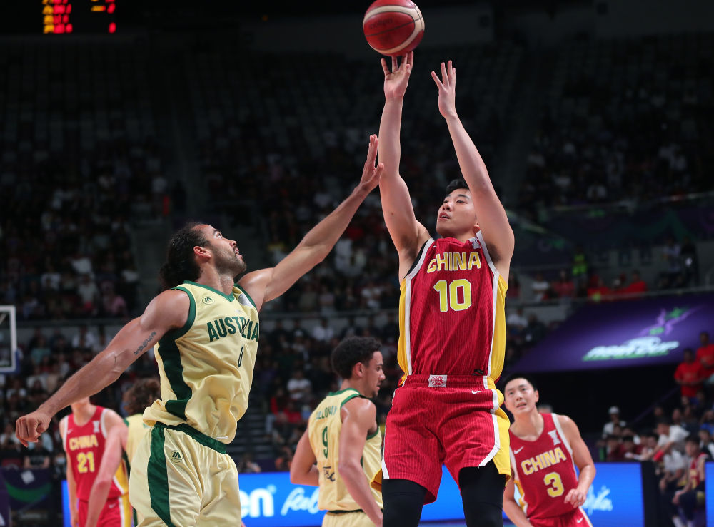 8月17日,中國(guó)隊(duì)球員王俊杰(前右)在比賽中投籃。新華社記者 王東震 攝