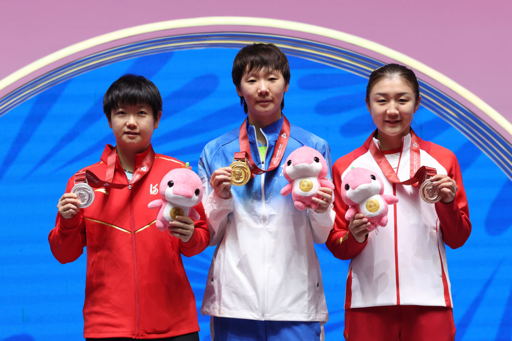 11月16日,冠軍黑龍江隊(duì)選手王曼昱(中)、亞軍河北隊(duì)選手孫穎莎(左)和季軍山東隊(duì)選手陳夢在頒獎(jiǎng)儀式上合影。新華社記者 梁旭 攝