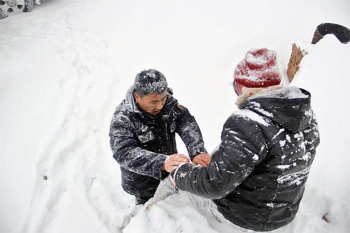 接到110指揮中心救援指令后,民警立即整裝出發(fā),并在途中與報(bào)警人周女士取得了聯(lián)系。車輛行至山間,救援難度超出了想象,整個(gè)山上都被大雪籠罩,白茫茫的一片,報(bào)警人也說不清自己遇險(xiǎn)的具體位置。救援民警想到與報(bào)警人通過微信聯(lián)系,獲得位置共享。在得到大概位置后,車輛卻遇到冰雪無法前行,救援民警只能徒步前往,在被冰雪覆蓋的山路上一腳深一腳淺地行走,也記不清一路上跌跌撞撞摔倒了幾次,眼看著快接近信息顯示位置了,卻無法準(zhǔn)確定位,只能繼續(xù)聯(lián)系報(bào)警人,讓她試著喊幾聲,以便確定具體方位,聽到聲音后,民警順著聲音方向前進(jìn),經(jīng)過一個(gè)多小時(shí)的艱難跋涉,終于在去往鳳林寺半山腰的樹林里找到了周女士。簡(jiǎn)單了解了周女士傷情后,民警康艷軍小心翼翼地把周女士一路背下了山,令其脫離了險(xiǎn)境。