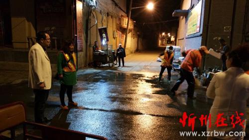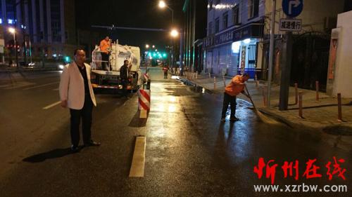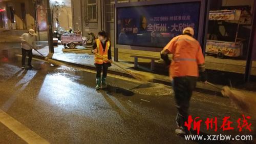 寂靜的夜晚伴隨著酒水車的轟鳴聲一股股清澈的水流噴灑在馬路上,街頭沉現(xiàn)著一個個揮舞著掃帚的橙黃色身影,點(diǎn)綴的忻州城區(qū)的夜色更加靚麗。