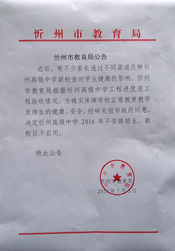 近日,有不少家長(zhǎng)通過(guò)不同渠道反映忻州市高級(jí)中學(xué)新校舍對(duì)學(xué)生健康的影響。忻州市教育局根據(jù)忻州市高級(jí)中學(xué)工程進(jìn)度及工程驗(yàn)收情況,為確實(shí)保障學(xué)校正常教育教學(xué)及師生的健康、安全,經(jīng)研究報(bào)市政府同意,決定忻州市高級(jí)中學(xué)2016年不安排招生,新校區(qū)不啟用。