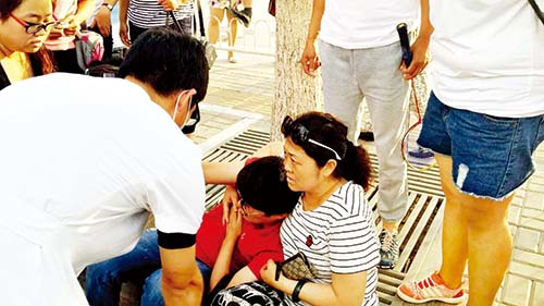 在等待救護(hù)車到來的時(shí)候,一位路過的老人遞過幾粒隨身攜帶的速效救心丸,劉增芬馬上將藥往男青年嘴里喂,卻怎么也喂不進(jìn)去。這時(shí),呂卓蔚也從藥店買來了速效救心藥品,劉增芬勸男青年張開嘴吃藥:“孩子,這是救命藥,快張開嘴啊?!碑惓M纯嗟哪星嗄暝诔詭状巍⒌魩状沃?,終于含服了幾粒藥。