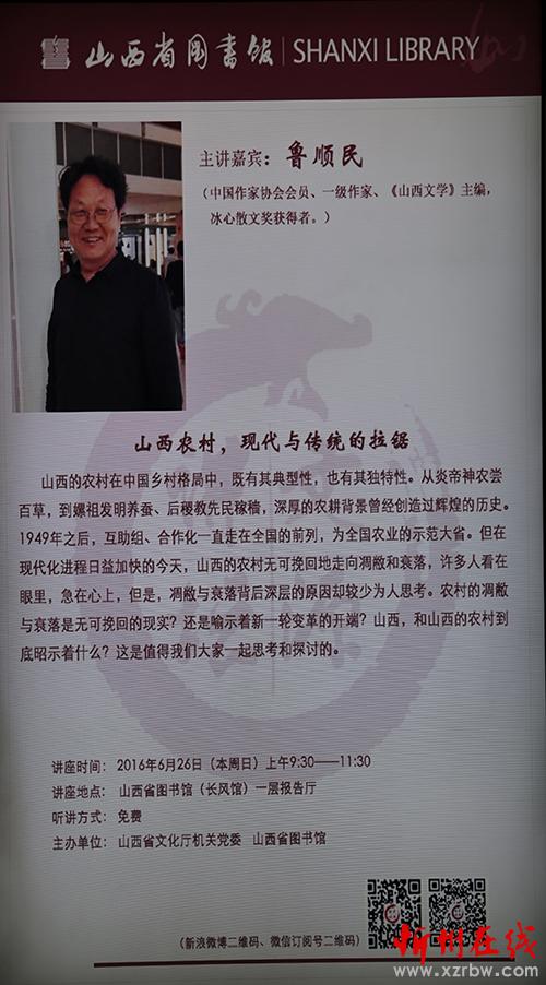 6月26日,魯順民作客山西省圖書館文源講壇,作了題為“山西農(nóng)村,現(xiàn)代與傳統(tǒng)的拉鋸”的講座。他從炎黃時期談起,鞭辟入里地講解山西農(nóng)業(yè)的歷史進程;他以黑峪口為例,入木三分地揭露農(nóng)村凋敝的原因;他從戶口制度切入,刻畫入微地分析當今農(nóng)民的現(xiàn)實問題,魯順民將其觀察與思考與觀眾分享交流,再次引發(fā)了人們的思考與討論。針對魯順民對于三農(nóng)問題的深刻見解以及在文學創(chuàng)作中的獨到之處,我們對其進行了專訪。