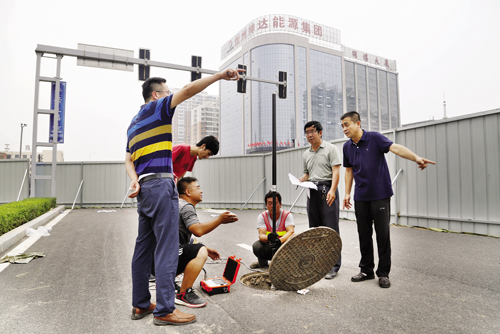 圖為技術(shù)人員現(xiàn)場檢測分析塌陷原因(趙曉煒 智芝龍 攝)