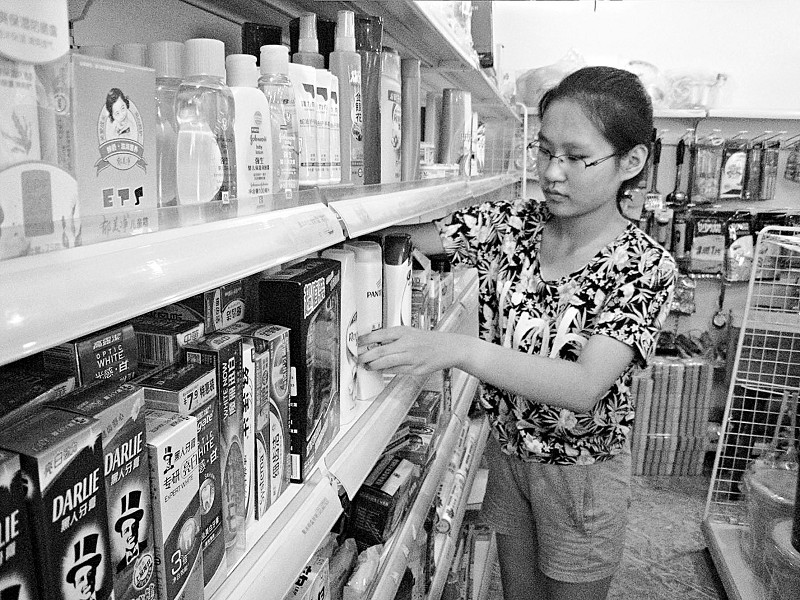 8月2日下午4點,記者見到王蔚桐時她正在整理超市貨架,把顧客挑選時挪動的商品放回原位,把新貨補充到空貨架上,再把貨架上的東西擺放整齊……額頭上的汗水浸濕發(fā)際,她也顧不上擦一把,還一個勁兒地道歉:“叔叔對不起,我已經(jīng)和老板請假了,把手頭這些活兒干完就能提前下班接受采訪了?!?/p>