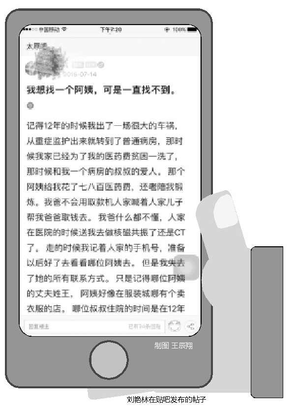 “尋找4年前,與我同住一個(gè)病房的病友,希望能在痊愈之后當(dāng)面感謝王阿姨王叔叔……”近日,22歲的忻州小伙劉艷林在百度貼吧里發(fā)了這樣一條尋人啟事,引起很多人的關(guān)注。原來,2012年6月20日,他因?yàn)橐粓?chǎng)嚴(yán)重的車禍,住進(jìn)了山醫(yī)大二院。治療期間,遇到了讓他這輩子不能忘記、甚至能稱之為親人的一對(duì)王姓夫婦,這對(duì)夫婦中的丈夫是與他同病房的病友。治療期間,劉艷林得到了夫婦倆無微不至的照顧。出院后,他們也一直保持著聯(lián)系,但后來因?yàn)槭謾C(jī)丟失,夫婦倆的電話號(hào)碼找不到了。