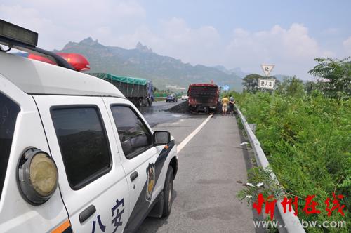 2016年8月6日上午11時20分,高速交警二支隊九大隊值班室接警陳:在五保高速(保五方向)32公里處有半掛車起火,請求出警。接到報警后,值班人員立即上報隊領(lǐng)導(dǎo),值班教導(dǎo)員牛治國立即安排部署,派出事故中隊立即趕赴現(xiàn)場,秩序中隊在耿鎮(zhèn)收費站進行分流。