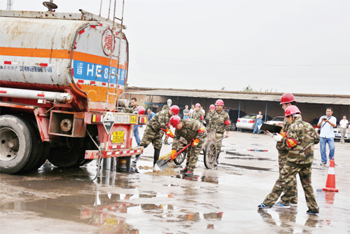 第三家上場(chǎng)的是安通危貨運(yùn)輸有限公司,他們演練的科目是液堿泄露處置。假定裝載液堿的危貨車行駛中發(fā)生泄露后,駕駛員和押運(yùn)員現(xiàn)場(chǎng)采取緊急措施,并請(qǐng)求公司火速救援。公司應(yīng)急救援組立即啟動(dòng)應(yīng)急預(yù)案,并向火警119、保險(xiǎn)公司報(bào)案。環(huán)境監(jiān)測(cè)組、現(xiàn)場(chǎng)救援組、事故現(xiàn)場(chǎng)警戒和人員疏散組、事故調(diào)查組立即到達(dá)現(xiàn)場(chǎng)分頭展開工作,泄漏液堿最終處置完畢,避免了二次事故和次生災(zāi)害的發(fā)生,未造成環(huán)境污染。