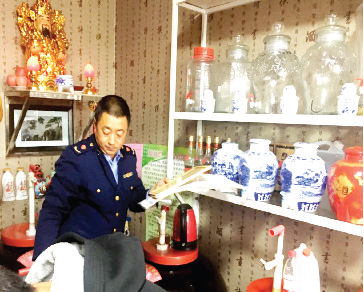 對新建路鄰街重點路段的運輸公司外包11戶經(jīng)銷戶逐戶進行督查,并提出限期整改的要求,依法依規(guī)查收1戶酒類經(jīng)營戶的執(zhí)照,責令其限期整改。在金豐市場內(nèi)組織召開了由各行政執(zhí)法部門領導、市場管理者參加的協(xié)調(diào)會議,就金豐市場各經(jīng)營戶的牌匾整治、破損廣告牌取締、衛(wèi)生死角清理等提出了具體措施和限期整改要求。當日下午,各經(jīng)營戶冒著小雨積極行動、加速整改,使金豐市場的環(huán)境大為改觀。圖為執(zhí)法人員依法依規(guī)檢查酒類經(jīng)營戶。(記者 張引弟)