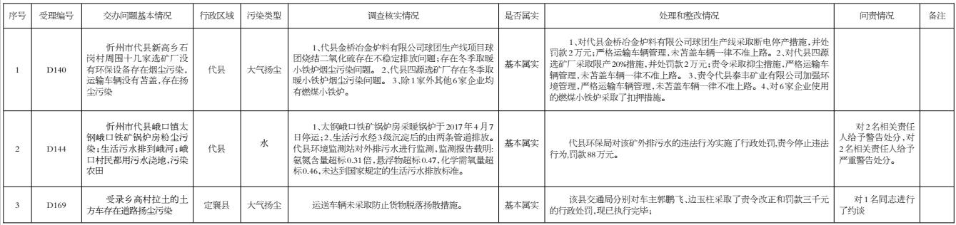 我市高度重視,立即組織查處,截至5月4日,督辦的3件群眾反映問題已辦結(jié)。其中,代縣確認(rèn)基本屬實(shí)的2件;定襄縣確認(rèn)屬實(shí)的1件。對(duì)于屬實(shí)已辦結(jié)的環(huán)保問題,分別采取了相應(yīng)處理措施,其中限產(chǎn)停產(chǎn)1件2家、查封扣押1件5家、罰款92.6萬元;目前,代縣對(duì)2名相關(guān)責(zé)任人給予警告處分、2名相關(guān)責(zé)任人給予嚴(yán)重警告處分;定襄縣對(duì)1名相關(guān)責(zé)任人進(jìn)行了約談;對(duì)3件群眾反應(yīng)問題調(diào)查處理情況進(jìn)行了信息公開。