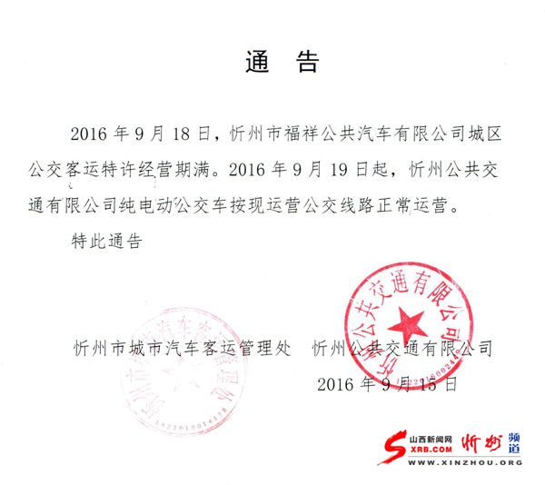 2016年9月18日,忻州市福祥公共汽車有限公司城區(qū)公交客運(yùn)特許經(jīng)營期滿。2016年9月19日起,忻州公共交通有限公司純電動公交車按現(xiàn)運(yùn)營公交線路正常運(yùn)營。