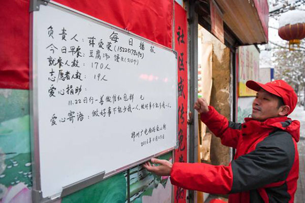 圖說(shuō):志愿者在懸掛“每日播報(bào)”,將早餐內(nèi)容、就餐人數(shù)等信息公布在愛(ài)心粥屋門(mén)口(11月23日攝)。圖片來(lái)源:新華社