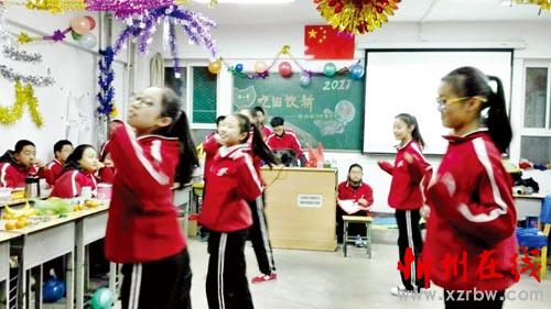 聯(lián)歡會(huì)由各班學(xué)生自己精心組織、排練,并由學(xué)生自主開展。同學(xué)們熱情高漲,積極參與,充分發(fā)揮自己的特長,表演自己最拿手的節(jié)目。每位同學(xué)都積極參與,每個(gè)人都成了“明星大腕”。班級(jí)聯(lián)歡會(huì)內(nèi)容豐富、精彩紛呈,舞蹈、歌曲、相聲、小品、游戲等節(jié)目一一亮相,喜慶祥和的氛圍濃厚強(qiáng)烈。圖為初二210班學(xué)生正在進(jìn)行節(jié)目表演。(郝江峰 攝)