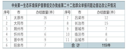 中央第一生態(tài)環(huán)境保護(hù)督察組交辦我省第二十二批群眾舉報(bào)問題119件,辦結(jié)119件。公示119件,其中太原市35件、大同市7件、朔州市7件、忻州市6件、晉中市9件、陽泉市7件、呂梁市12件、長治市15件、晉城市7件、臨汾市8件、運(yùn)城市6件。可登錄山西省人民政府網(wǎng)站或掃描二維碼查閱群眾信訪舉報(bào)轉(zhuǎn)辦和邊督邊改公開情況一覽表。