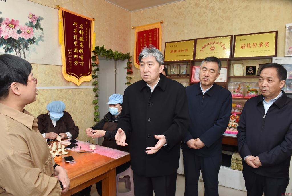 走訪入戶李紅霞。馮曉磊 攝 非遺傳承人李紅霞主要從事面塑工藝品和花饃制作與銷售工作,由她創(chuàng)辦的紅霞鄉(xiāng)情守藝坊,吸收了當?shù)責o業(yè)和老弱病殘人員20余人。走訪中,朱曉東來到李紅霞處,詳細了解面塑的歷史、現(xiàn)狀、未來發(fā)展方向,詢問她在經(jīng)營、培訓、傳承中存在的困難和問題。朱曉東指出,非遺傳承人是非物質文化遺產(chǎn)重要的承載者和傳承者,在傳統(tǒng)文化和民間藝術的延續(xù)發(fā)展中發(fā)揮著關鍵性作用。要積極主動為傳承人搭建展示推廣平臺,讓珍貴的傳統(tǒng)技藝有序、有效傳承下去。希望傳承人進一步堅定文化自信,結合時代發(fā)展的特點,不斷推陳出新,做好產(chǎn)品研發(fā)和創(chuàng)新,注重實用價值轉化,在宣傳、品質、特色和工業(yè)化、標準化方面下功夫,開展好授徒傳藝,賦予非遺項目新的活力,將“小花饃”產(chǎn)業(yè)做大做強。
