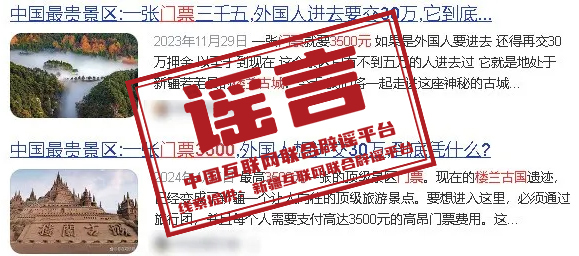 真相:近日,社交媒體平臺上流傳“新疆樓蘭故城一張門票3500元”“羅布泊門票20元”等信息,甚至有網(wǎng)民給樓蘭故城冠以“中國最貴景區(qū)”的名頭,引發(fā)關(guān)注。對此,樓蘭故城遺址所在地新疆若羌縣“若羌文旅”官方賬號辟謠稱,“樓蘭故城3500元門票”“羅布泊20元門票”的說法都是假的。樓蘭故城從未對外開放過,廣大游客若想了解樓蘭文化,可以到若羌縣樓蘭博物館進(jìn)行了解。此外,羅布泊是無人區(qū),禁止非法穿越。(來源:“新疆網(wǎng)絡(luò)辟謠”微信公眾號)