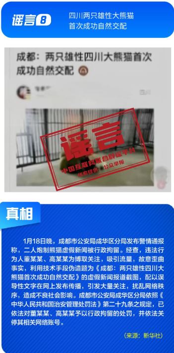 ??針對(duì)各類網(wǎng)絡(luò)謠言與亂象,多部門開展協(xié)同治理,聯(lián)動(dòng)整治。1月16日,中央網(wǎng)信辦召開全國網(wǎng)絡(luò)辟謠聯(lián)動(dòng)機(jī)制第三次全體會(huì)議,部署以辟謠工作新成效助力清朗網(wǎng)絡(luò)空間建設(shè)。中央網(wǎng)信辦聯(lián)合工業(yè)和信息化部等部門持續(xù)整治汽車行業(yè)網(wǎng)絡(luò)亂象,處置一批涉嫌挑動(dòng)對(duì)立、炒作負(fù)面話題、違規(guī)測(cè)評(píng)的賬號(hào);國家廣播電視總局開展“AI魔改”視頻專項(xiàng)治理,各平臺(tái)處置大量違規(guī)內(nèi)容。各地網(wǎng)信部門積極行動(dòng),陜西西安深入開展房地產(chǎn)領(lǐng)域網(wǎng)絡(luò)專項(xiàng)行動(dòng),處置散布樓市謠言的房產(chǎn)中介賬號(hào),四川成都依法處置30余個(gè)惡意關(guān)聯(lián)地域、污名化城市的違規(guī)賬號(hào)。公安機(jī)關(guān)依法打擊造謠傳謠人員。擺拍“小女孩在學(xué)校跳蚤市場(chǎng)用50元淘到名酒”、利用AI偽造“假救護(hù)車非法轉(zhuǎn)運(yùn)”、編造“兩只雄性四川大熊貓首次成功自然交配”等謠言的相關(guān)責(zé)任人已依法被予以行政處罰。