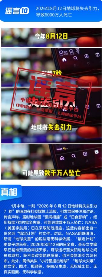 ??健康與科普領(lǐng)域謠言違背客觀規(guī)律?!叭搜椎鞍资恰黾用庖吡Α姆▽殹笨桃饪浯笤撎幏剿幍呐R床用途,忽略其特定醫(yī)療場(chǎng)景與使用風(fēng)險(xiǎn);所謂“大棚草莓、冷庫葡萄、進(jìn)口車?yán)遄印⑷旧疤情偈嵌焖缢拇蠖就酢敝{言片面解讀農(nóng)產(chǎn)品種植與保鮮方式,缺乏科學(xué)依據(jù);“四川兩只雄性大熊貓首次成功自然交配”純屬為吸引流量而捏造的獵奇內(nèi)容,其視頻畫面為AI生成;“2026年8月12日地球?qū)⑹ヒΓ瑢?dǎo)致6000萬人死亡”更是無中生有的荒謬謠言。