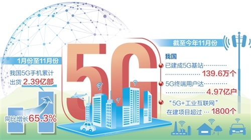 同時(shí),我國(guó)5G終端不斷豐富。據(jù)中國(guó)信通院數(shù)據(jù),今年1月份至11月份,我國(guó)5G手機(jī)累計(jì)出貨2.39億部,同比增長(zhǎng)65.3%。