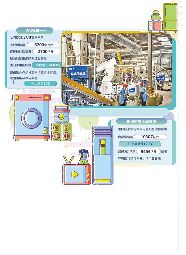 自《推動(dòng)大規(guī)模設(shè)備更新和消費(fèi)品以舊換新行動(dòng)方案》(以下簡(jiǎn)稱《行動(dòng)方案》)實(shí)施以來,家電市場(chǎng)消費(fèi)潛力得到顯著釋放。數(shù)據(jù)顯示,2024年,中央加力支持以舊換新八大類家電產(chǎn)品實(shí)現(xiàn)銷售量6200多萬臺(tái),直接拉動(dòng)消費(fèi)近2700億元。日前,國家發(fā)展改革委副主任趙辰昕在國務(wù)院政策例行吹風(fēng)會(huì)上介紹,2025年將延續(xù)并加力擴(kuò)圍實(shí)施“兩新”政策,享受以舊換新補(bǔ)貼的家電產(chǎn)品種類由2024年的8類增至12類,單件最高補(bǔ)貼可達(dá)銷售價(jià)格的20%。
