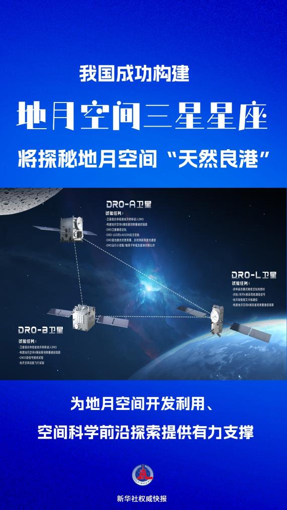 記者從中國(guó)科學(xué)院空間應(yīng)用工程與技術(shù)中心獲悉,我國(guó)已成功構(gòu)建由三顆衛(wèi)星組成的地月空間三星星座,將聚焦地月空間遠(yuǎn)距離逆行軌道(DRO)開展深入科學(xué)研究。