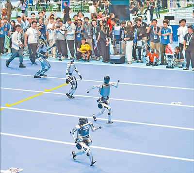 圖為機器人在開幕式上開展100米賽跑。新華社記者 謝 晗攝