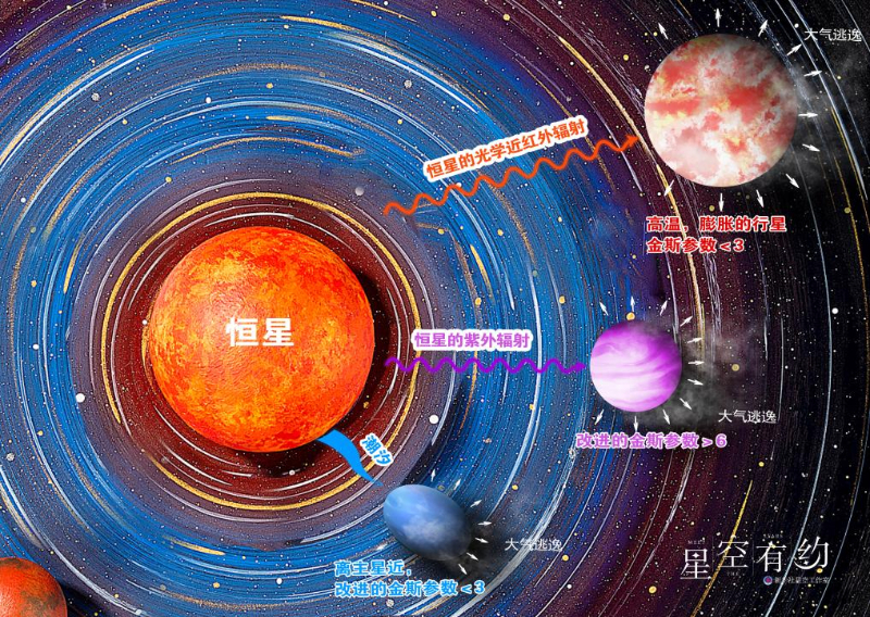 郭建恒說,在那些低質(zhì)量和大半徑的行星上,若行星有足夠的內(nèi)能或較高溫度,便可驅(qū)動(dòng)大氣逃逸。研究發(fā)現(xiàn)使用經(jīng)典的金斯參數(shù),即行星內(nèi)能和勢能的比值,就可對上述逃逸是否發(fā)生做出判斷;對于內(nèi)能無法驅(qū)動(dòng)大氣逃逸的行星,該研究通過引入恒星的潮汐力,定義了一個(gè)改進(jìn)的金斯參數(shù)?!巴ㄟ^它,我們就能對恒星潮汐力和極端紫外輻射在驅(qū)動(dòng)大氣逃逸上的角色進(jìn)行區(qū)分?!?/p>
