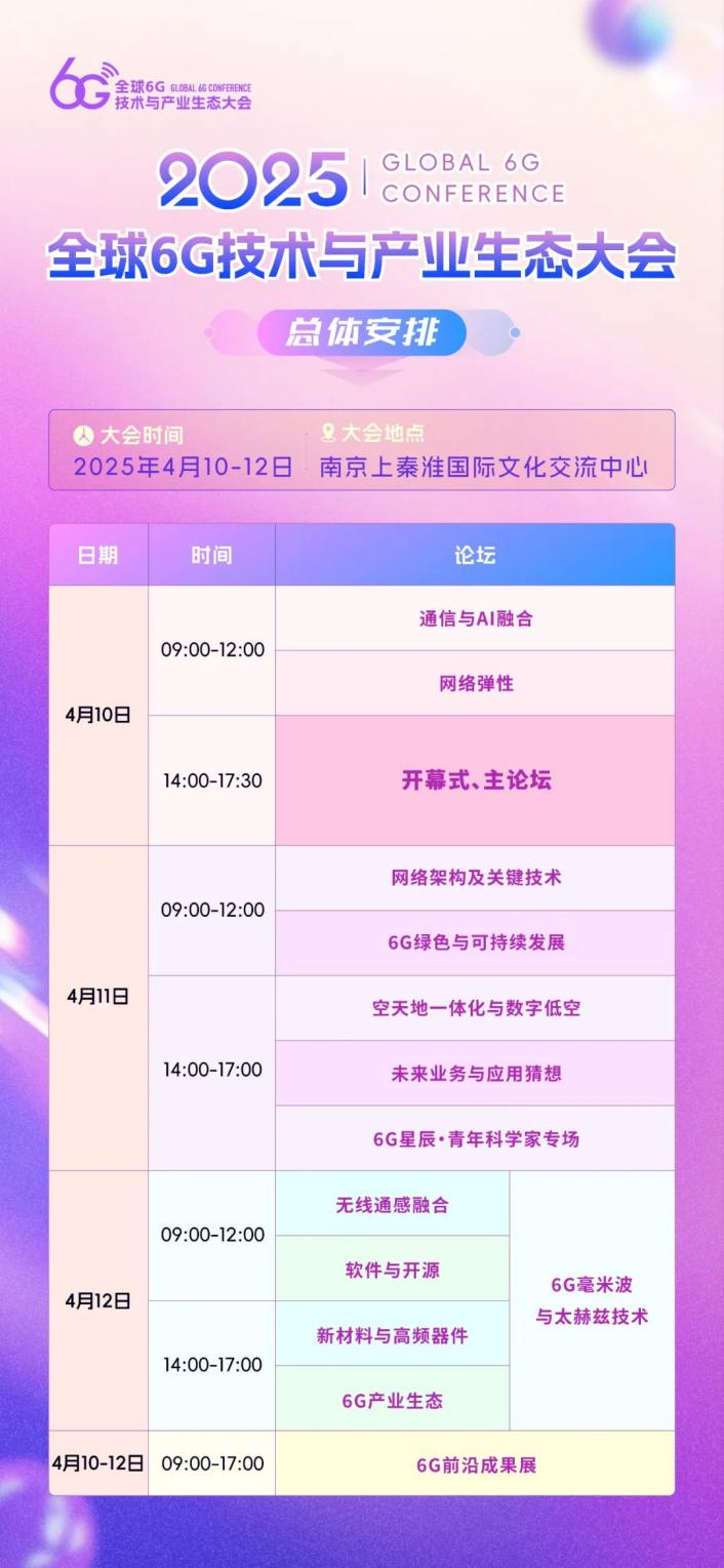 4月10日至12日,由未來移動(dòng)通信論壇、紫金山實(shí)驗(yàn)室主辦的2025全球6G技術(shù)與產(chǎn)業(yè)生態(tài)大會(huì)(原全球6G技術(shù)大會(huì))將在南京上秦淮國(guó)際文化交流中心召開。本次大會(huì)以“共筑創(chuàng)新 同享未來”為主題,來自全球的6G領(lǐng)域的思想領(lǐng)袖、技術(shù)先鋒和產(chǎn)業(yè)領(lǐng)軍人物將再次齊聚金陵,共同探討6G技術(shù)創(chuàng)新與未來產(chǎn)業(yè)生態(tài)的發(fā)展藍(lán)圖。