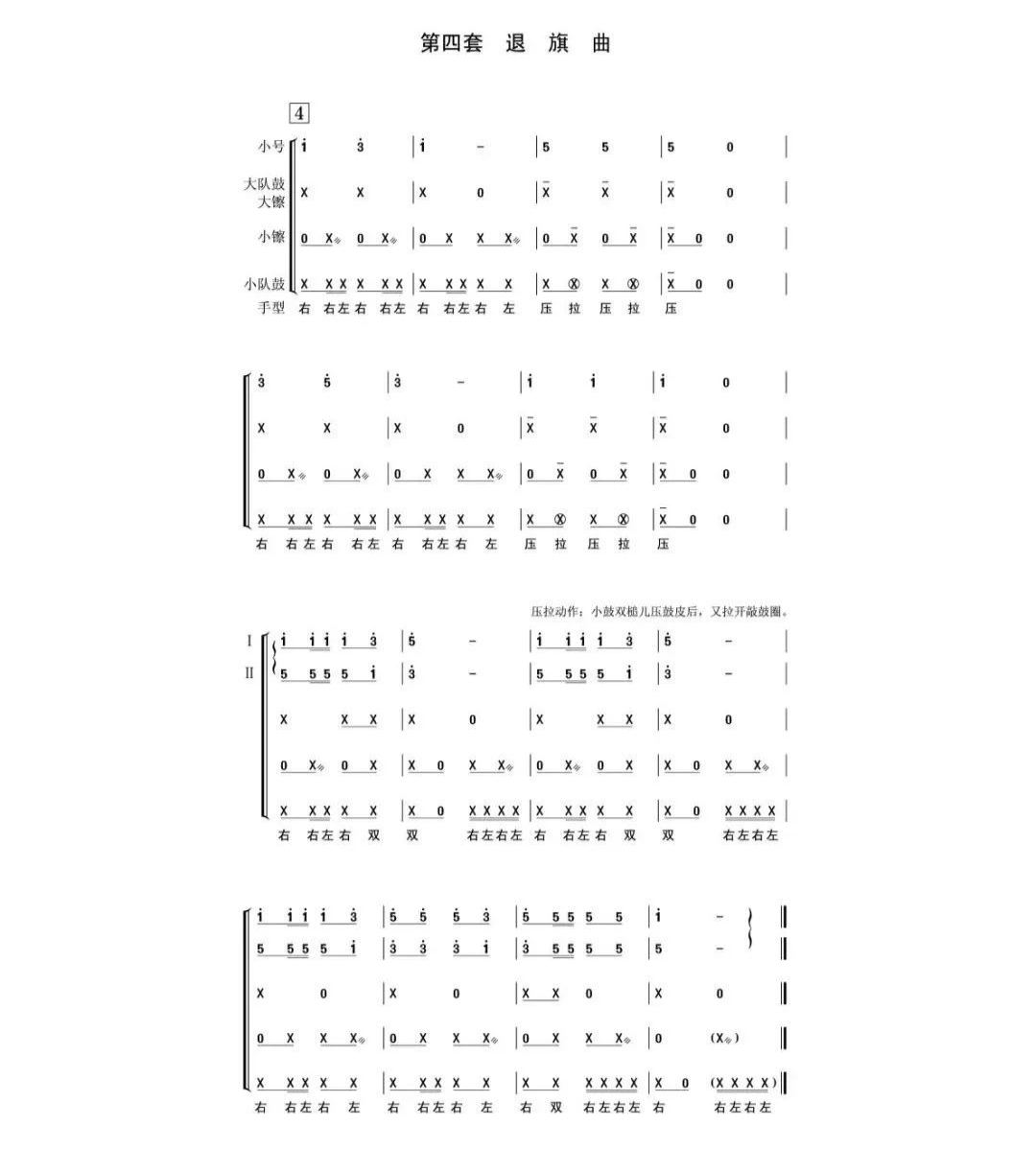 1.右手持旗(杖),指揮動作包括持樂器、預(yù)備、起式、運行、收式、下樂器,左手輔助指令,表示演奏程序。