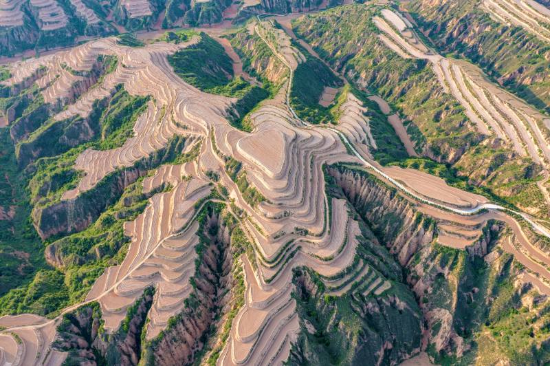 圖為層層梯田,阡陌縱橫。 然而,就在幾十年前,這里到處都是光禿禿的荒坡。 山西臨汾市永和縣是典型的黃土高原梁峁殘?jiān)珳羡謪^(qū),山巒起伏,梁峁層疊,大小2500多條溝道縱橫交錯(cuò)。全縣有35萬(wàn)畝耕地,其中70%以上為坡耕地。 “那時(shí)候種地,主要靠耕牛和人工。一圈下來(lái),累得我呀,那汗水滴溜溜就往下淌?!被貞浧饋?lái)當(dāng)年的情形,57歲的坡頭鎮(zhèn)呼家莊村村民段交平仍然記憶深刻。 為了實(shí)現(xiàn)耕地有效利用,從2010年起,永和縣在芝河源頭的高山上開(kāi)始了“坡改梯田”工程。 “在單一的坡耕地治理基礎(chǔ)上,我們逐步探索出了坡耕地改造、壩灘聯(lián)治、經(jīng)濟(jì)林栽植、荒山造林、設(shè)施改善‘五位一體’的綜合治理模式?!庇篮涂h副縣長(zhǎng)馬進(jìn)介紹。 據(jù)介紹,實(shí)施綜合治理以來(lái),永和縣改造機(jī)修梯田將近10萬(wàn)畝,不僅水土流失問(wèn)題得到控制,生態(tài)環(huán)境也得到了顯著改善。全縣林木覆蓋率由治理前的17%,提高到現(xiàn)在的46.5%;年流失泥沙量比治理前減少48.7%以上,年可減少泥沙流失量88.3萬(wàn)噸。
