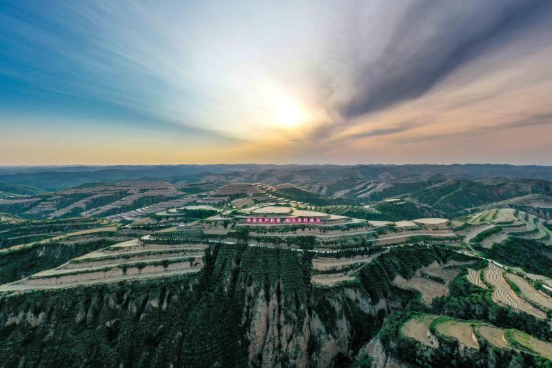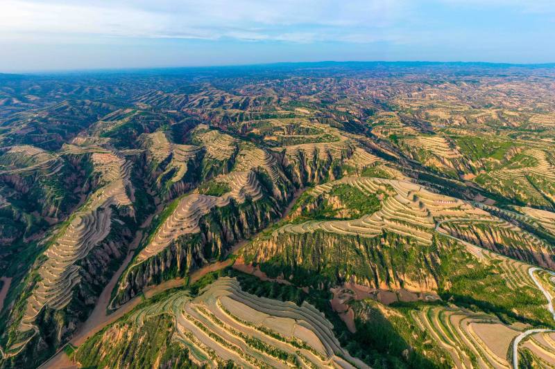 仲夏六月,碧空如洗。 站在永和梯田觀景臺(tái)上,一壟壟地膜像一條條白色的絲帶,纏繞在層層疊疊的梯田間。連綿的山坡間、山塬上,鋪滿了綠色的盛裝——油松、連翹,還有地里的高粱苗,正孕育著無(wú)限的生機(jī)活力。