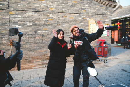 龍祥鳳瑞迎新春、龍躍鳳舞鬧新春、龍章鳳彩賀新春,熱鬧的平遙中國年吸引不少外國友人來打卡,吃美食、看文化、當(dāng)回“晉商少奶奶”。“平遙古城歷史悠久,是曾經(jīng)的‘中國華爾街’,在全世界都非常著名,晉商票號讓人感到震撼?!迸D月廿七中午,剛剛結(jié)束山西大同行程的葡萄牙游客Joao與哥哥來到平遙古城。Joao是一位中國歷史愛好者,談起腳下的平遙古城連連豎起大拇指,“我們特意把平遙的旅程放在春節(jié)這段時間,要轉(zhuǎn)轉(zhuǎn)古城的歷史遺跡,還要看看古城的特色演出,感受一番地道的中國年。”