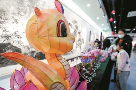 1月11日,“春風(fēng)文潤(rùn) 迎春展演暨惠民活動(dòng)”在位于南京的江蘇省文化館新街口文化客廳舉行,讓市民通過(guò)看演出、觀展覽、享非遺等多種形式,在家門(mén)口享受高品質(zhì)的文藝活動(dòng)。圖為市民們?cè)诨顒?dòng)中參觀非遺項(xiàng)目秦淮燈彩。