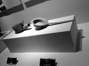 唐朝就已經(jīng)有熨斗了。展廳中,展出了兩把熨斗,一把是唐朝的,一把是清朝的。唐朝的熨斗有一個(gè)短短的把手,中間是一個(gè)大凹槽。
