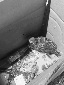 一位村民說:“我是在路邊看到它的,可走到它身邊,它卻沒飛走,是不是受傷了?”另一位村民指著紙箱里的“漂亮的鳥”說:“看它的外形、顏色,都跟平常見的鳥不一樣……”兩位村民擔(dān)心自己處置不當(dāng),于是便送往派出所,向民警求助。