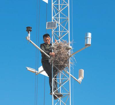 沙林中心科研人員對沙塵觀測塔進(jìn)行維護(hù)。