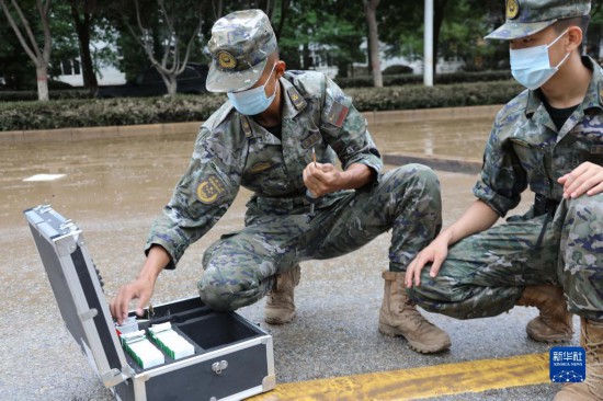 8月6日,武警河北總隊(duì)機(jī)動(dòng)支隊(duì)官兵在河北涿州高新區(qū)騰飛大街勘測(cè)檢查氣體環(huán)境。新華社發(fā)(趙佳亮 攝)