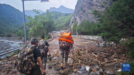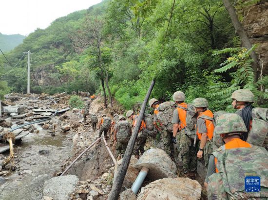 因山洪暴發(fā),北京市門頭溝區(qū)齋堂鎮(zhèn)交通中斷。武警北京總隊(duì)機(jī)動(dòng)第一支隊(duì)?wèi)?yīng)急救援隊(duì)徒步15公里山路,人均負(fù)重25公斤,為12個(gè)村運(yùn)送食品、醫(yī)藥、防疫、照明等基礎(chǔ)物資,保障村民基本生活。