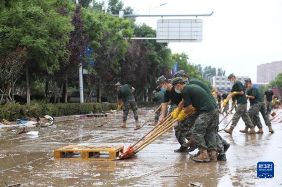 8月6日,武警河北總隊(duì)機(jī)動(dòng)支隊(duì)官兵在河北涿州騰飛大街范陽路至朝陽路段清淤清障。新華社發(fā)(趙佳亮 攝)