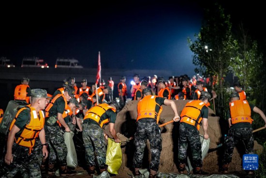 武警河北總隊(duì)邢臺(tái)支隊(duì)官兵在河北邢臺(tái)南澧河李召橋左岸大堤加固堤壩(7月31日攝)。新華社發(fā)(張羽 攝)