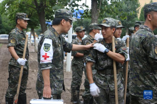 8月6日,武警河北總隊(duì)醫(yī)院巡診組在河北涿州陽光大街清理淤泥點(diǎn)位詢問戰(zhàn)士傷情。新華社發(fā)(楊雪乾 攝)