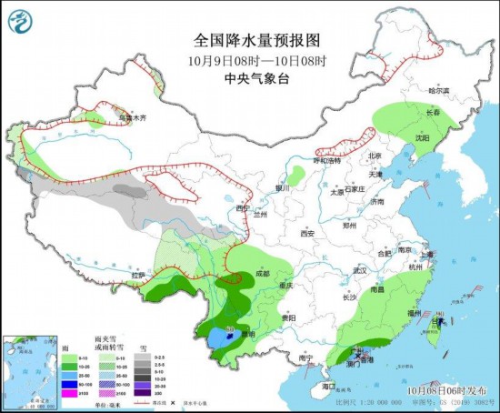 圖2 全國降水量預報圖(10月9日08時-10日08時)