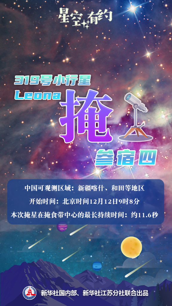 新華社南京12月10日電(記者邱冰清、秦華江)中國(guó)科學(xué)院紫金山天文臺(tái)科普主管王科超介紹,北京時(shí)間12月12日,319號(hào)小行星Leona將掩恒星參宿四。最早能看到本次掩星過(guò)程的是中國(guó)新疆喀什、和田等地區(qū),開始時(shí)間是當(dāng)日9時(shí)8分。本次掩星在掩食帶中心的最長(zhǎng)持續(xù)時(shí)間約為11.6秒。